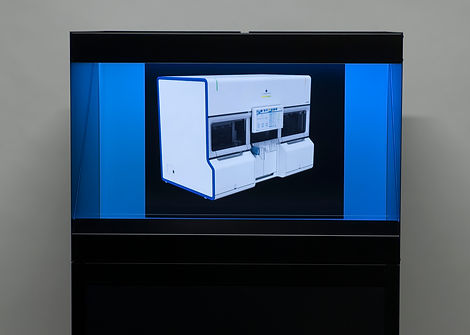 La vitrine intègre des surfaces blanches diffusantes destinées à produire l'éclairage de couleur réglable. Le réglage colorimétrique est possible au moyen de 3 dimmers RVB.